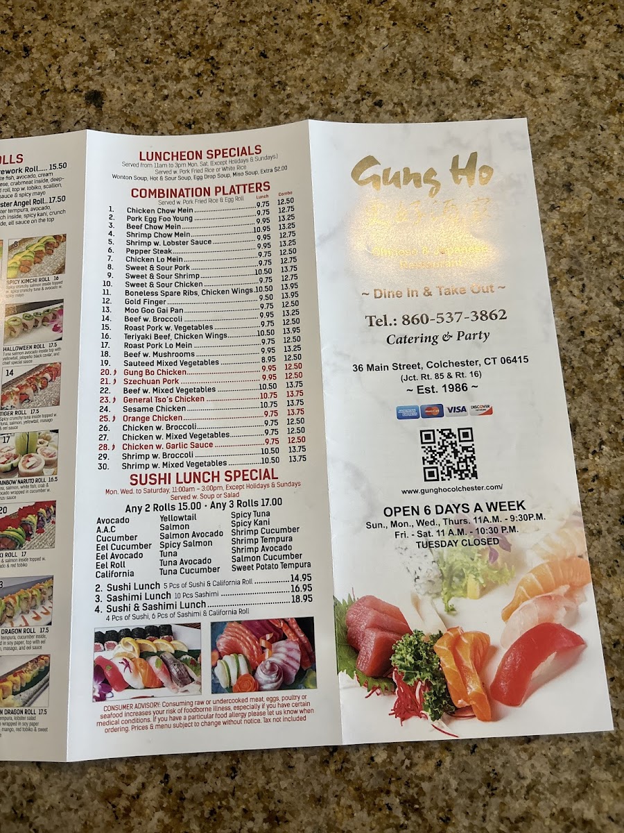 Welcome to Gung Ho, a gem nestled on 36 Main St, Colchester, CT. This charming restaurant marries the best of Asian cuisine in a harmonious dining experience that you won't want to miss. Offering a rich tapestry of flavors, Gung Ho specializes in sushi, Chinese, Thai, Vietnamese, and Japanese dishes. Whether you prefer the freshness of their sushi rolls or the robust taste of their Asian entrees, there's something here for every palate.